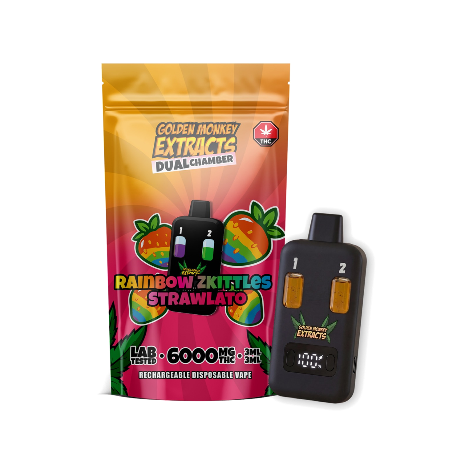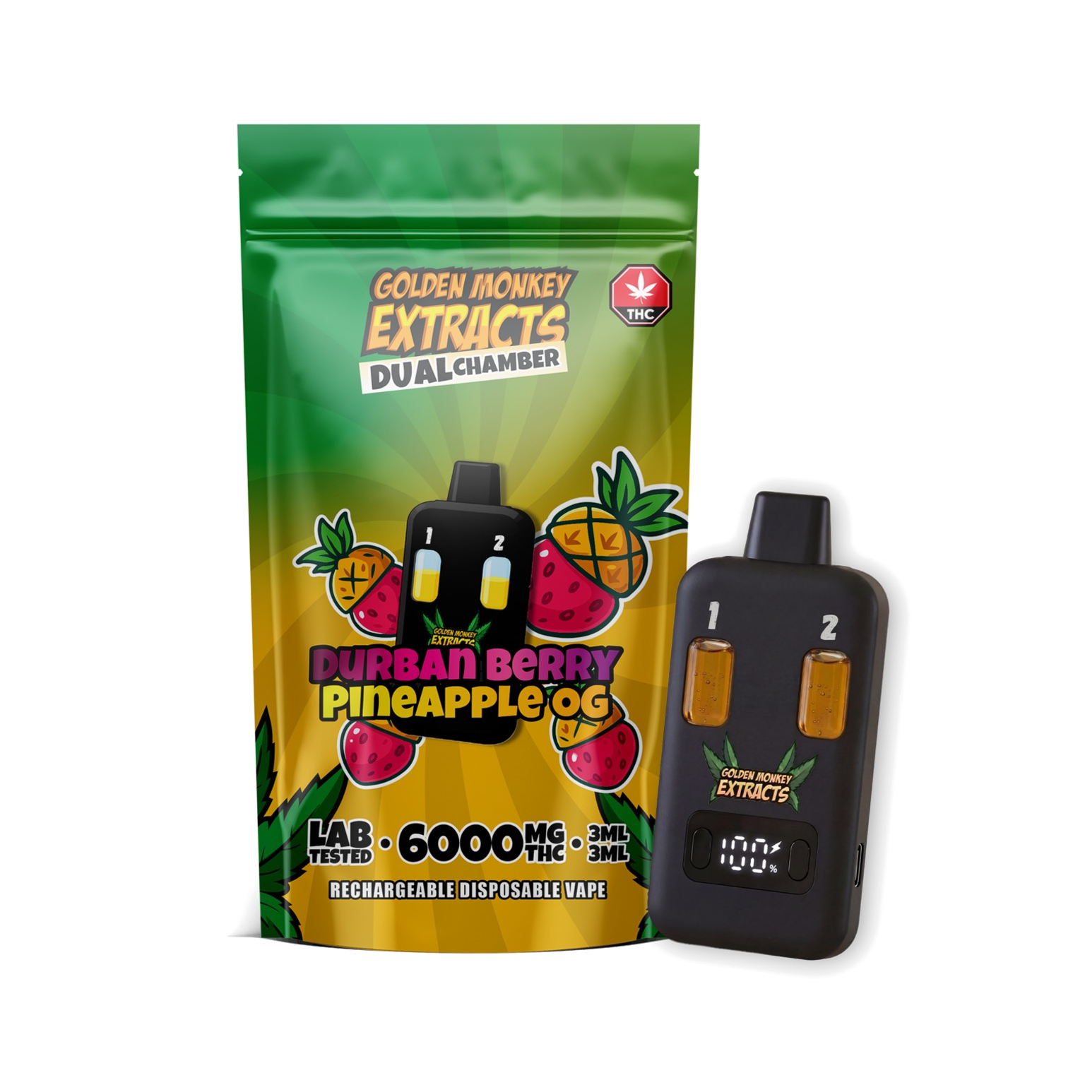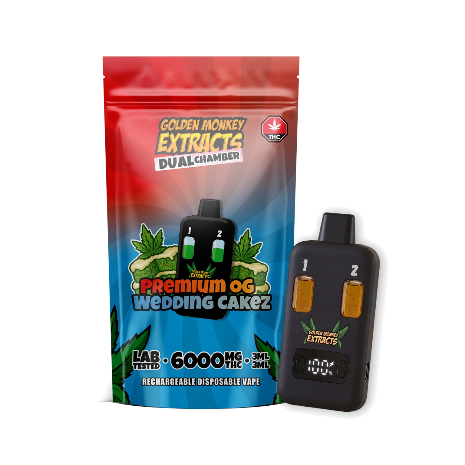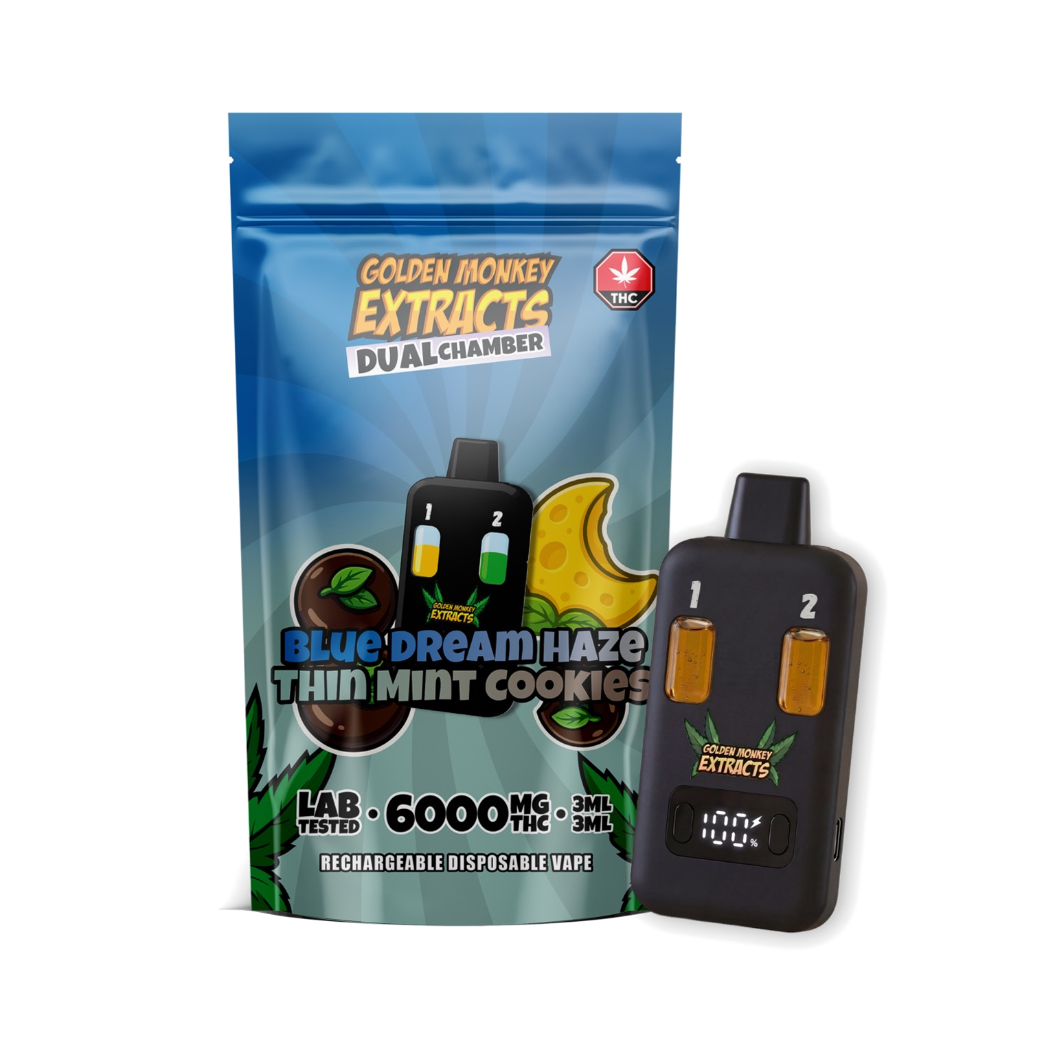 Welcome to the future of high-capacity cannabis vaping. Golden Monkey Extracts (GME) has officially raised the bar with their brand new 6000mg Dual Chamber Rechargeable Disposable Vape. Designed for consumers who demand ultimate convenience, extreme potency, and variety in the palm of their hand, this device is an absolute game-changer.
